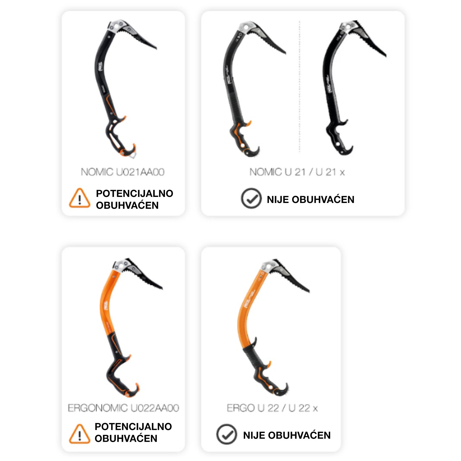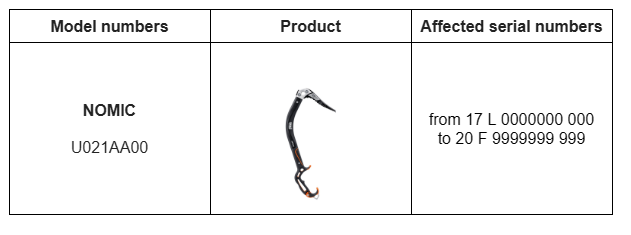 Opoziv određenih serija cepina NOMIC (U021AA00) i ERGONOMIC (U022AA00) zbog rizika od loma drške, što može uzrokovati pad penjača. Odmah prestanite koristiti sve cepine obuhvaćene ovim opozivom i kontaktirajte našu postprodajnu službu radi zamjenske drške.